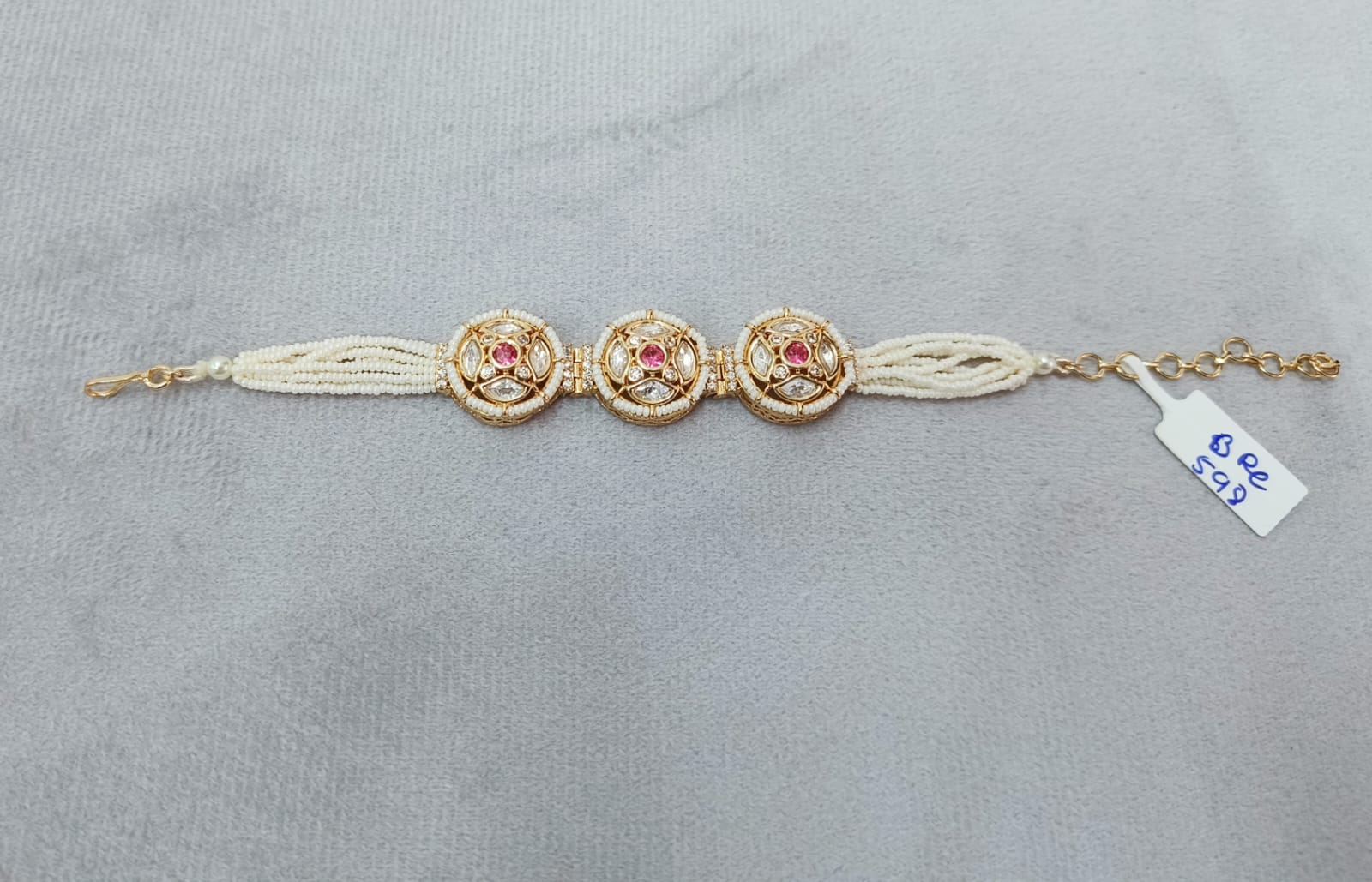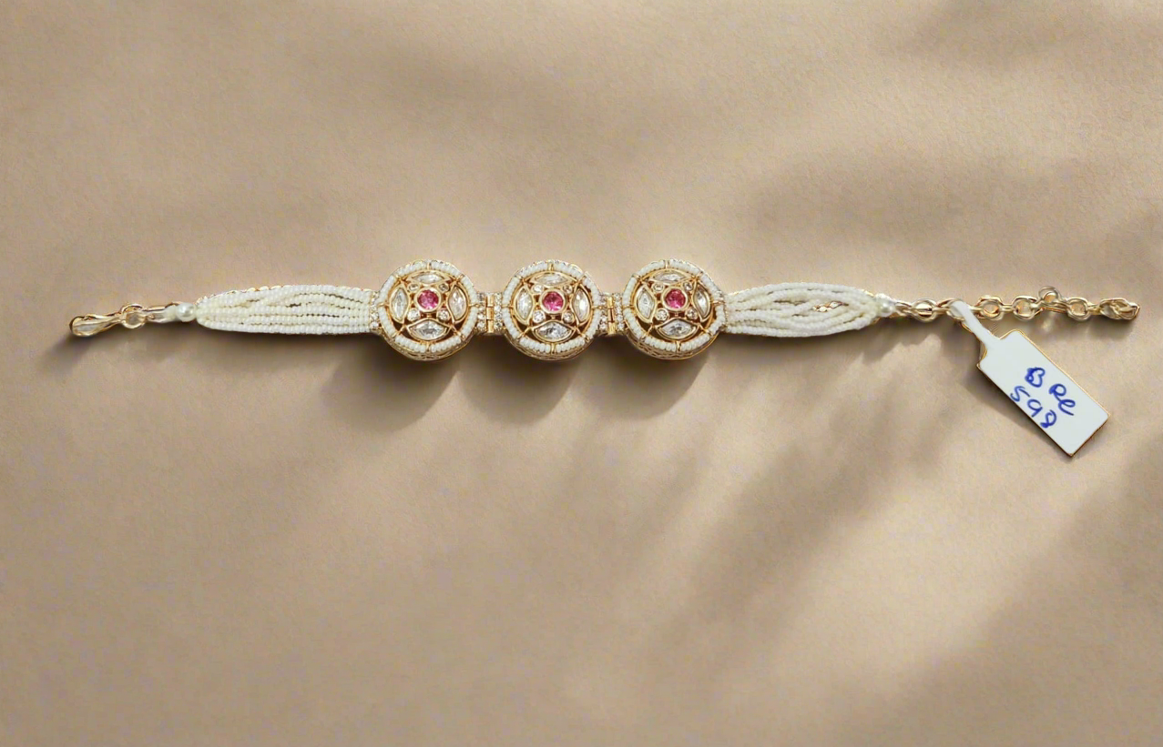 This exquisite traditional bracelet features a distinctive combination of elegance and intricacy. It showcases three prominent circular gold elements, each set with a vibrant pink gemstone at its center. Surrounding the pink stone are smaller, shimmering white gemstones arranged symmetrically, which add a touch of brilliance. These gold elements are seamlessly linked by multiple strands of petite, luminous white beads that form the bracelet's band. The overall design is a harmonious blend of craftsmanship and heritage.
