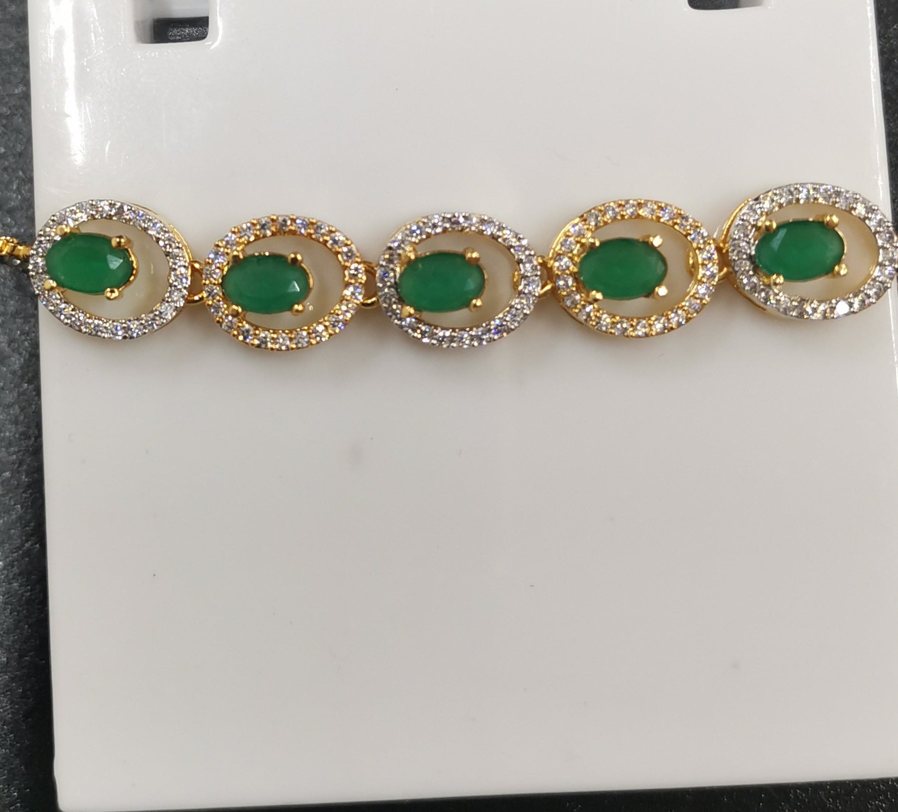Expertly designed, this Brc00 638s tennis bracelet boasts a high quality two tone plating and lightweight brass metal. The centred emerald, adorned with sparkling American diamonds, adds a touch of elegance to any outfit. Perfect for adding a touch of sophistication to your wardrobe.