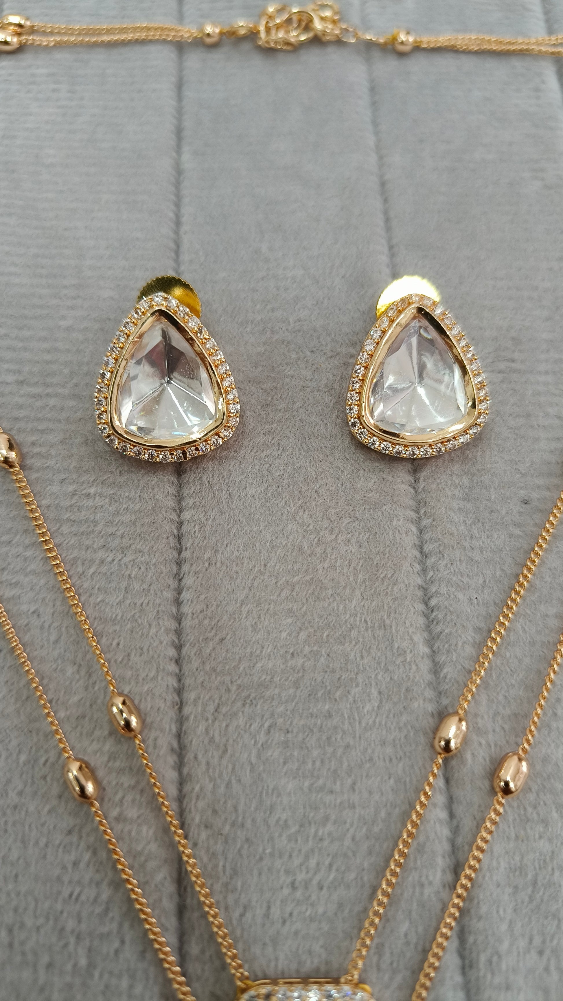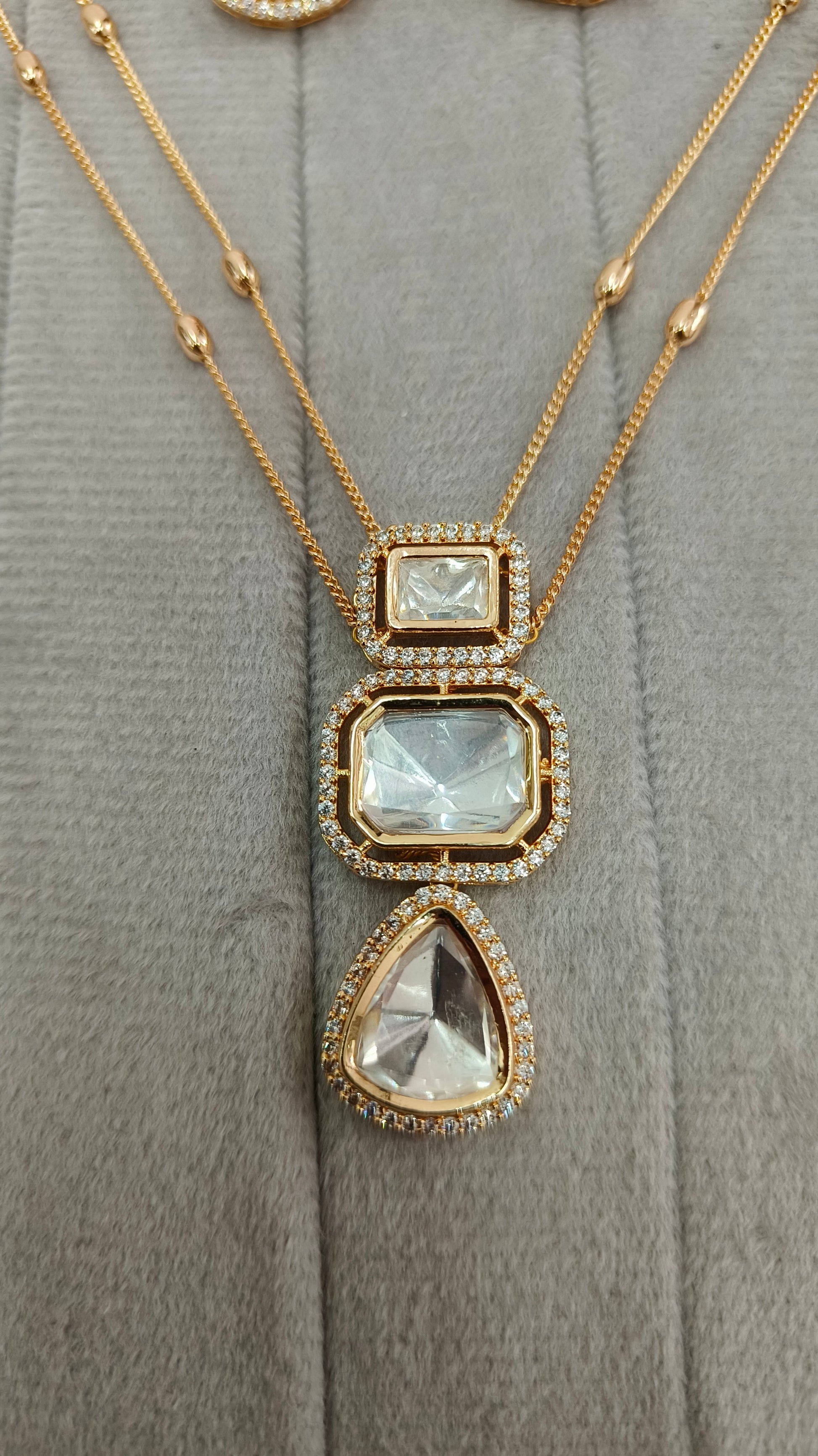 Elevate your style with our CPDS00 225s pachi kundan chain pendant set. This double layered set features exquisite royal pachi Kundan and sparkling AD stones, perfect for daily wear. Stand out with elegance and class.