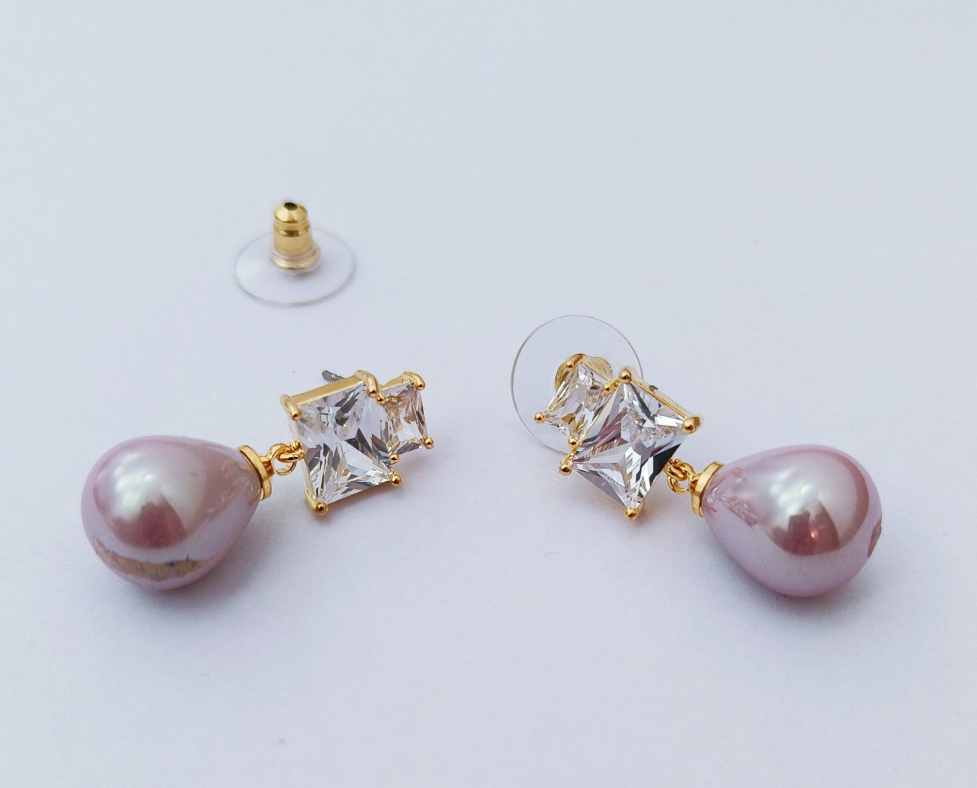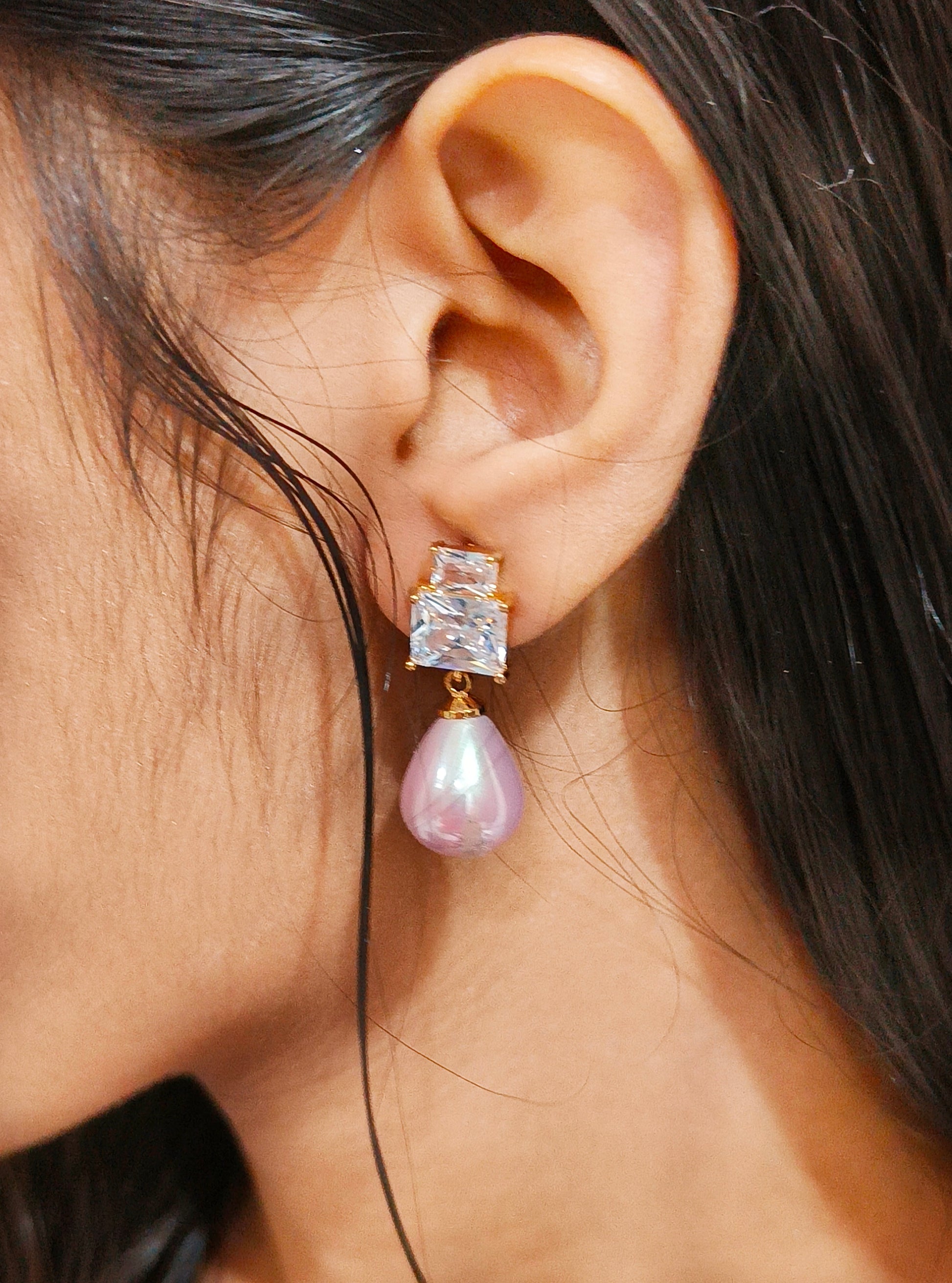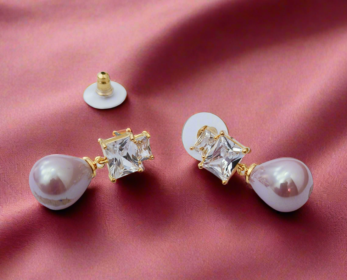 These earrings exude sophistication and elegance! They feature a stunning combination of a large, teardrop-shaped pearl and a square-cut clear gemstone, both set in gold plated premium metal. The stud design ensures a classic look. Perfect for formal occasions or adding a refined touch to an outfit, they seamlessly blend luxury with timeless appeal.