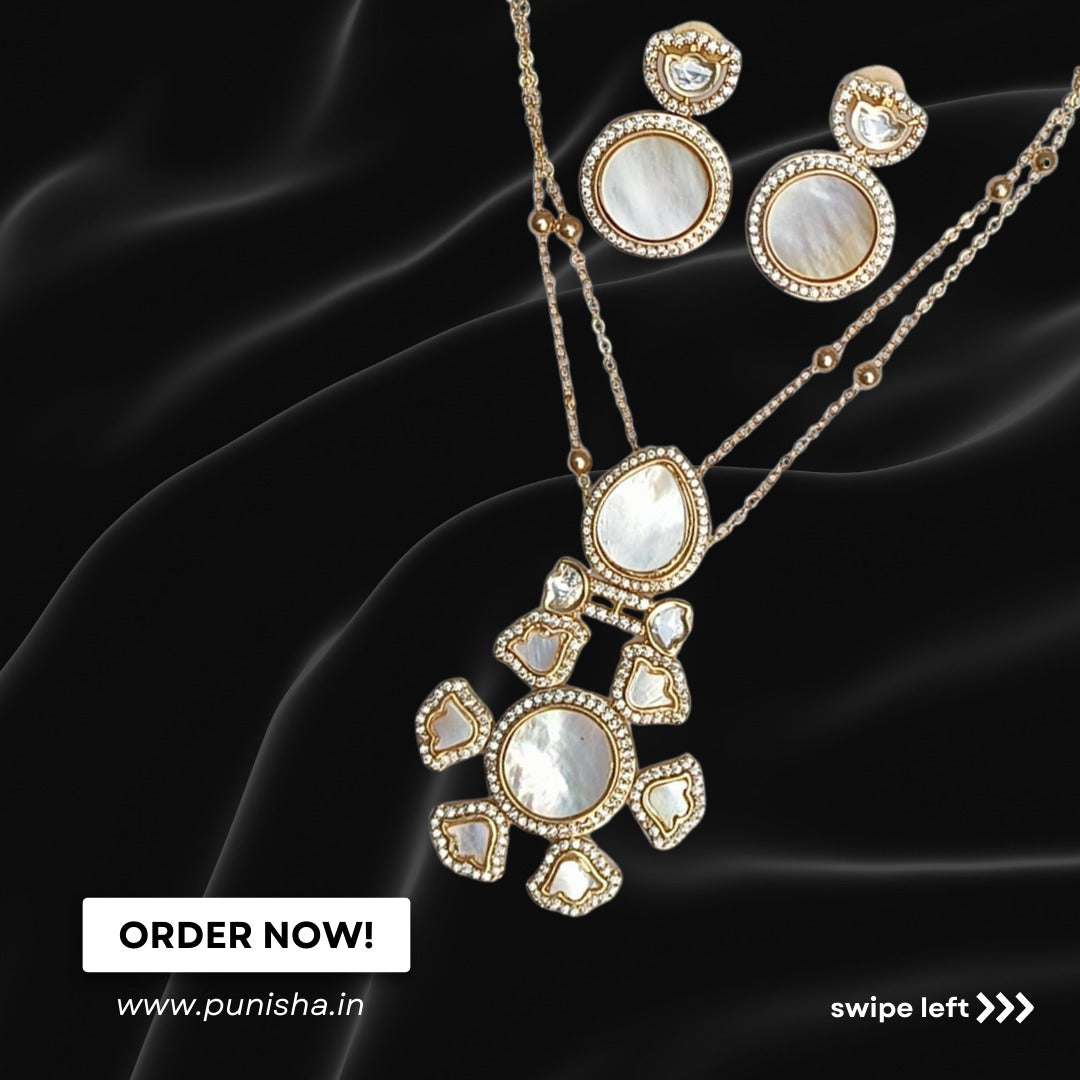 Crafted by expert artisans, the MOP N KUNDAN F SUN CPDS offers a royal touch with its mother of pearl and vilandi kundan arrangement. The intricate sun design adds a touch of elegance to the gold plated pendant set, complete with earrings and chain. Elevate your style with this stunning set.