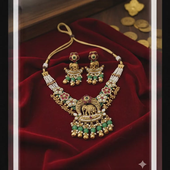 Matching Royal Earrings: The set is perfectly complemented by matching drop earrings. These feature miniature elephant motifs, kundan stones, and green bead clusters, echoing the necklace's grandeur and framing your face in regal splendor.