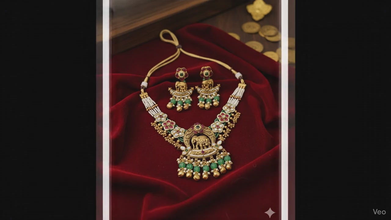 Majestic Elephant Pendant: The central pendant is a regal spectacle, featuring a beautifully sculpted elephant (Gaja), a symbol of strength, wisdom, and good fortune, encased within an ornate, antique-gold frame. Delicate ruby-red accents add a pop of color to the elephant's crown.