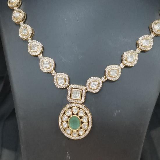The stunning short necklace features a single line of meticulously set, lustrous Polki-style stones, each encircled by a brilliant halo of sparkling American Diamonds (AD). This elegant strand culminates in a statement pendant, where a captivating emerald-green stone glows from within a floral-inspired setting, adding a touch of regal color and sophistication.