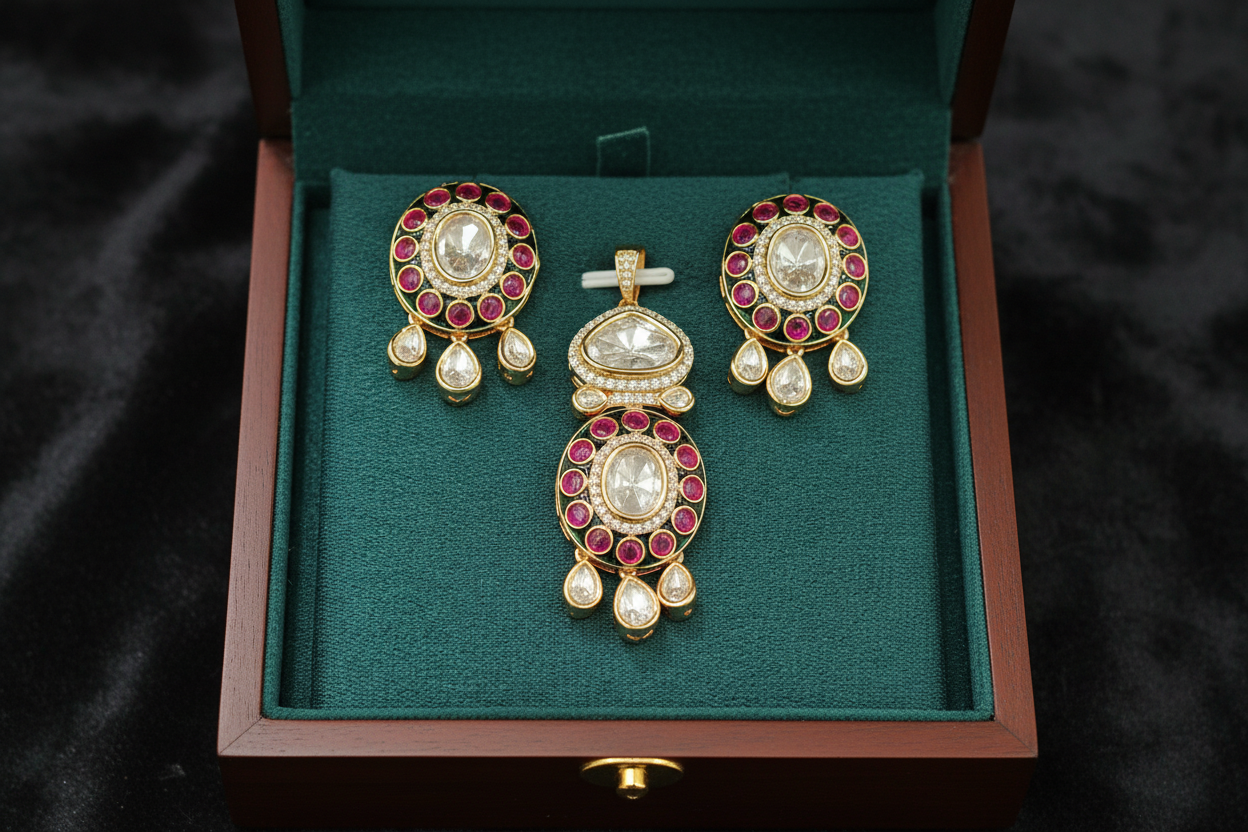 Garnished with Polki Kundans, the symbol of Royals.