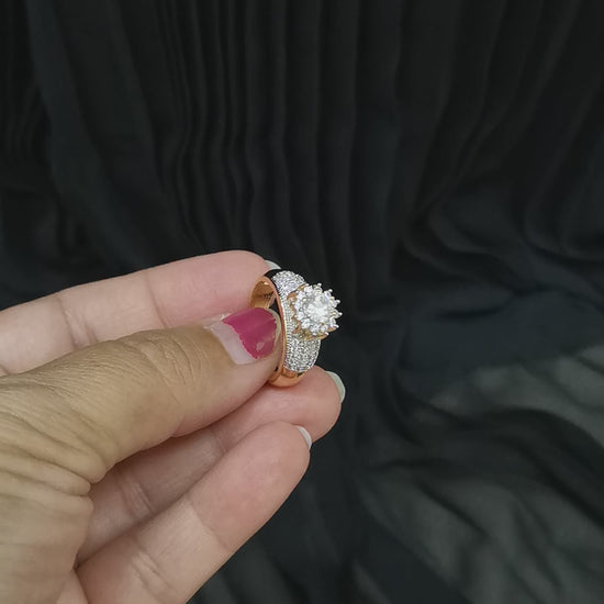 The ring's central feature is a magnificent cluster setting, designed to mimic a large, flawless solitaire. The main stone is surrounded by a radiating halo of smaller, brilliant-cut simulants, creating a stunning sunburst or floral effect that maximizes light refraction and sparkle. This premium cluster achieves the volumetric impact of a multi-carat diamond.